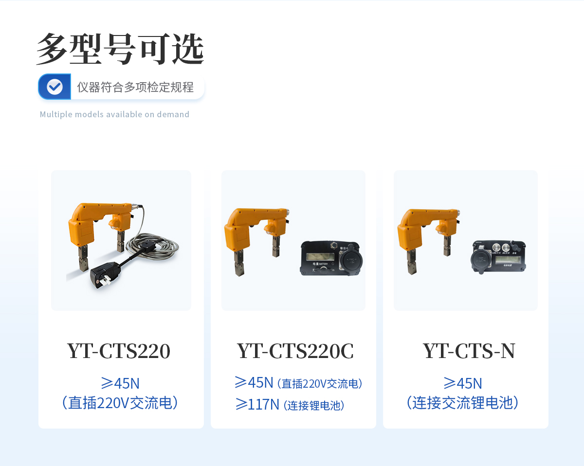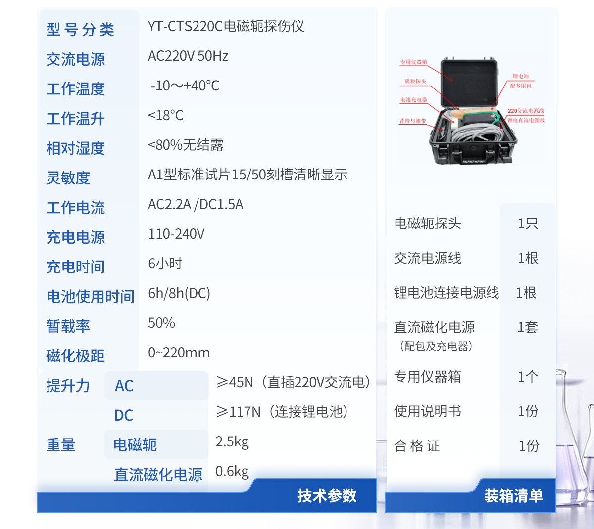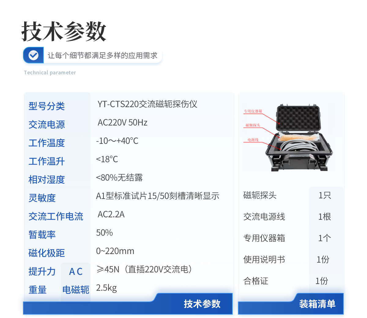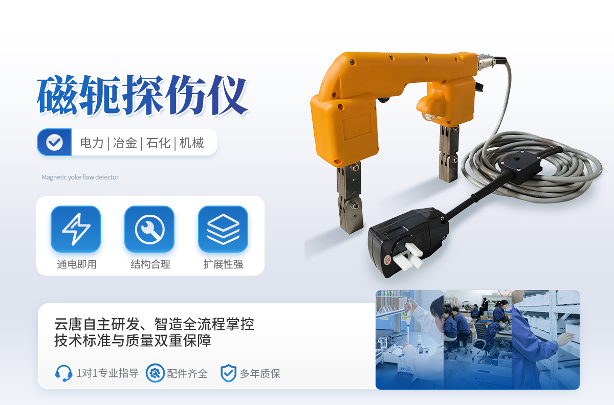 YT-CTS220交流磁軛探傷儀 ,無主機(jī)設(shè)計(jì),操作簡(jiǎn)單方便,噪音小、重量小、適用性強(qiáng),工作穩(wěn)定。適用于電力、冶金、石化、機(jī)械等行業(yè)各類鋼鐵結(jié)構(gòu)件,鍋爐、壓力容器、壓力管道及各類型焊接結(jié)構(gòu)的鐵磁性材料表層及近表層缺陷的磁粉探傷。該探傷儀可以直接連接交流電使用,也可以選配交流磁化電源和直流磁化電源使用,**輕便。特別適用于船體焊縫檢測(cè)、高空鋼結(jié)構(gòu)焊縫檢測(cè)及壓力容器內(nèi)部作業(yè)。