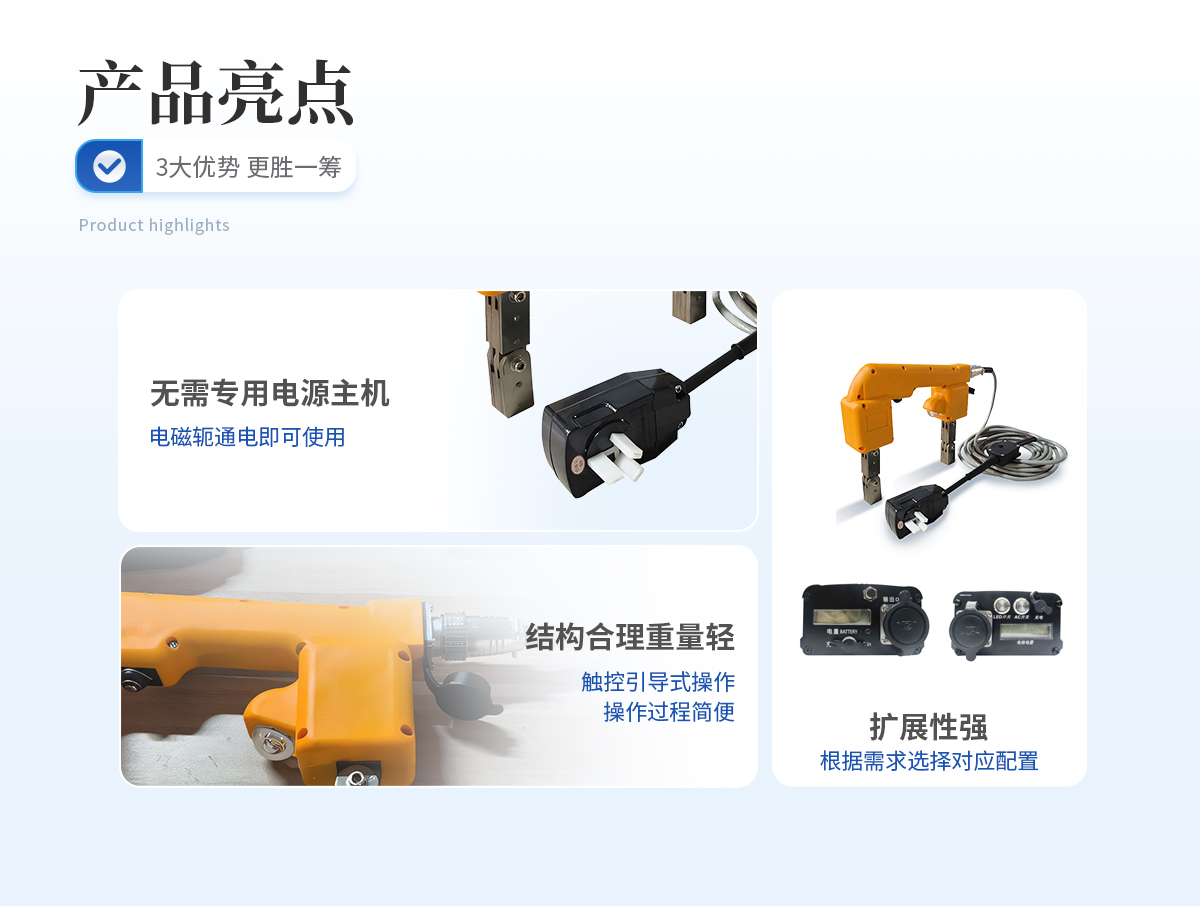 | 1、 無需專用電源主機(jī),電磁軛通電即可使用; | 2、 體積小巧,重量輕; | 3、 開模制作,結(jié)構(gòu)合理,手感舒適; | 4、 磁軛標(biāo)配白光燈,可選熒光燈(不額外加費(fèi)用); | 5、 配專用儀器箱; | 6、 擴(kuò)展性強(qiáng),可根據(jù)需要增配對(duì)應(yīng)的專用電池包,通過專用電源來實(shí)現(xiàn)交流、直流磁化功能。可滿足不方便拖電源線的場(chǎng)所使用。 |