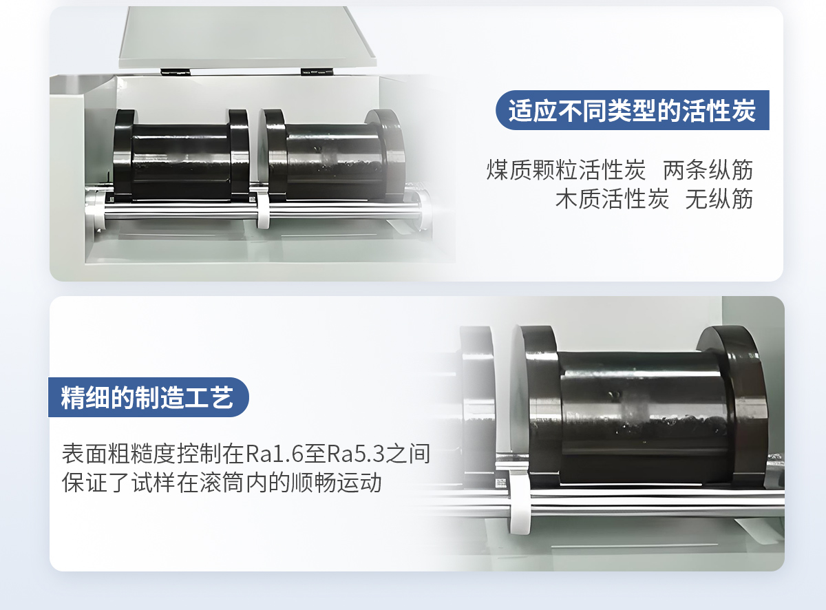 活性炭強(qiáng)度測定儀儀按照規(guī)定的試驗(yàn)條件,將活性炭試料置于裝有鋼球的滾筒中,開啟強(qiáng)度測定儀,開始計(jì)時(shí),通過滾筒的機(jī)械運(yùn)動(dòng),試料被磨損,測定被破壞試料粒度的變化情況,用保留在試驗(yàn)篩上的試料質(zhì)量占原試料的質(zhì)量分?jǐn)?shù),可求出活性炭試樣的強(qiáng)度。