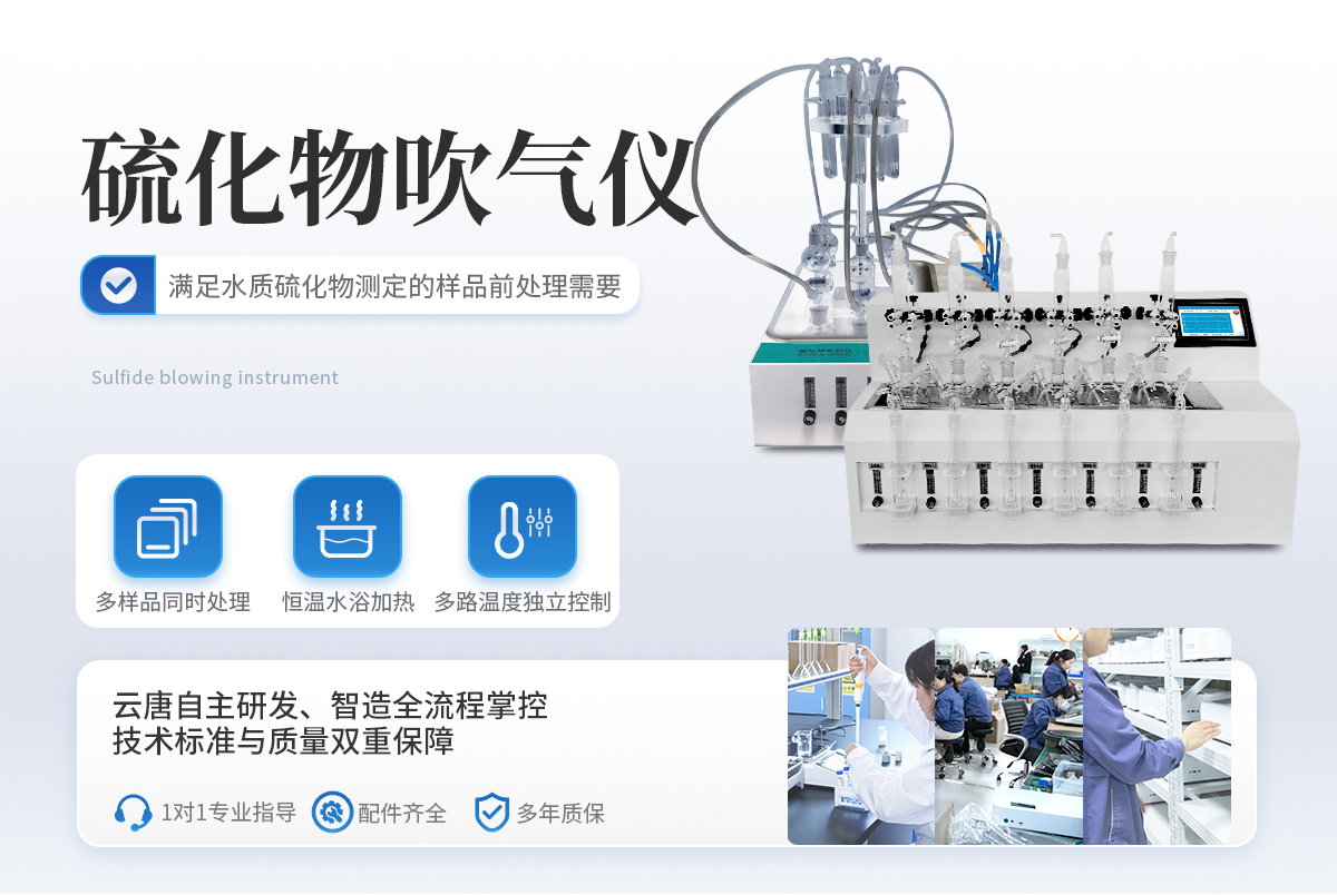 水樣中的硫化物經酸化,生成的硫化氫隨載氣(氮氣)進入吸收瓶/吸收顯色管中被吸收溶液(乙酸鋅-乙酸鈉溶液或2%氫氧化鈉溶液)吸收,選擇相應的分析方法對吸收瓶/吸收顯色管中吸收的硫離子進行分析測定。水質硫化物酸化吹氣儀根據2022年新國標水質硫化物的測定-亞甲基藍分光光度法(典量法)標準開發生產的。水質硫化物測定的樣品前處理需要。