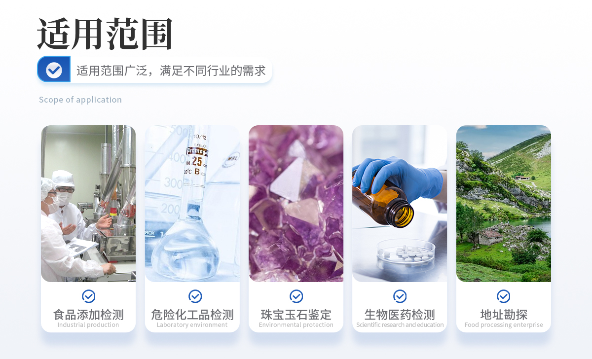 食品違禁添加物、色素添加、農(nóng)獸藥殘留檢測(cè) 爆炸物、危險(xiǎn)化工品、易燃易爆品檢測(cè) 珠寶玉石鑒定、文物鑒別 生物醫(yī)藥檢測(cè)、材料表征、地址勘探等 其他各類(lèi)訂制應(yīng)用
