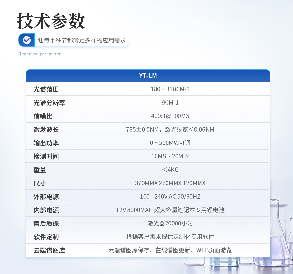規(guī)格:YT-LM標(biāo)準(zhǔn)版 光譜范圍:180 ~ 3300cm-1 光譜分辨率:9cm-1 信噪比:400:1@100ms 激發(fā)波長(zhǎng):785+0.5nm,激光線寬< 0.06 nm 輸出功率:0~ 500mW可調(diào) 檢測(cè)時(shí)間:10ms ~ 20min 重量:<4kg 尺寸:370mmx 270mmx 120mm 外部電源:100-240V AC 50/60Hz 內(nèi)部電源:12V 8000mAH 超大容量筆記本專(zhuān)用鋰電池 售后質(zhì)保:激光器20000小時(shí) 軟件定制:根據(jù)客戶需求提供定制化專(zhuān)用軟件 云端譜圖庫(kù):支持云端譜圖保存、 在線譜圖更新、WEB 頁(yè)面瀏覽