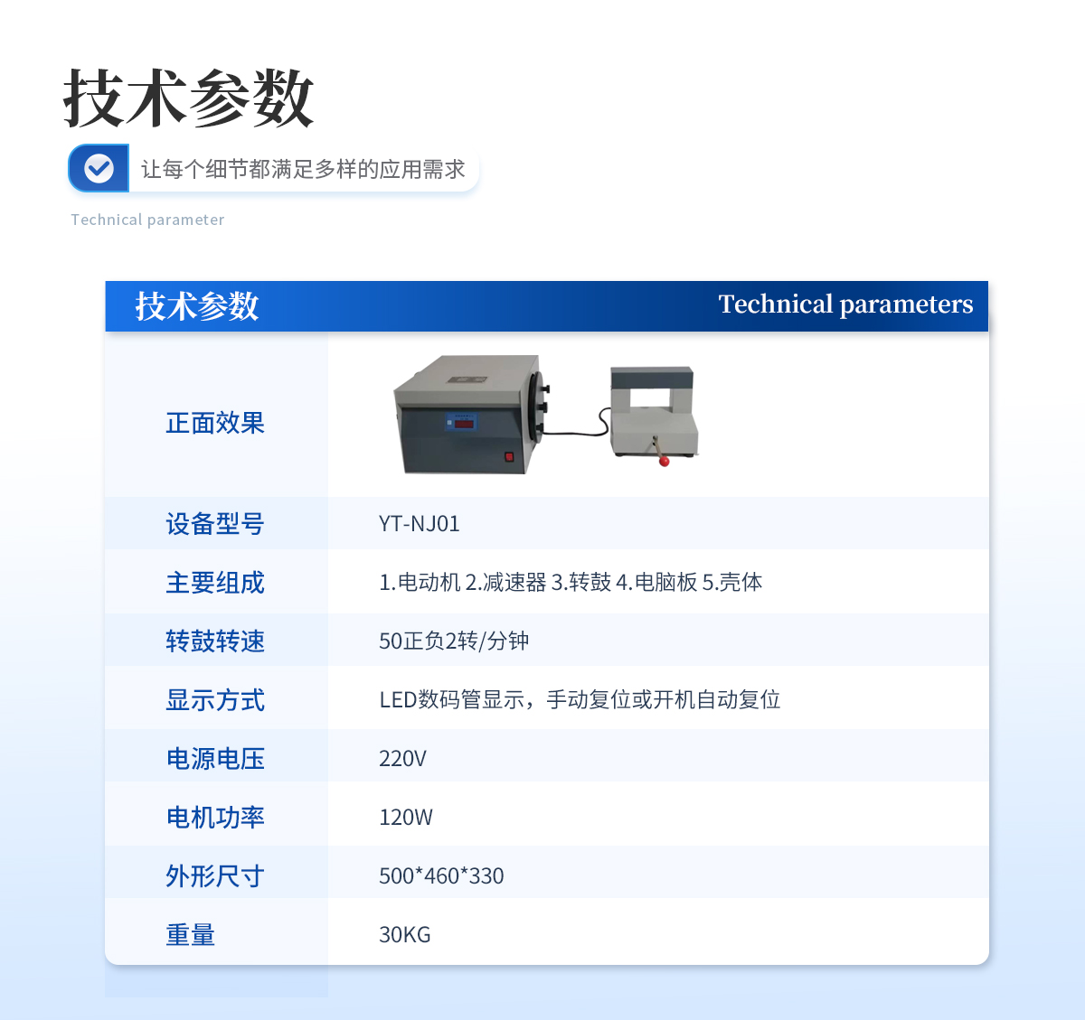 | 1.轉(zhuǎn)鼓轉(zhuǎn)速 50正負(fù)2轉(zhuǎn)/分鐘 | 2.顯示方式 LED數(shù)碼管顯示,手動復(fù)位或開機自動復(fù)位 | 3.電源電壓 220V | 4.電機功率 120W | 5.外形尺寸 500*460*330 | 6.重量 30KG |