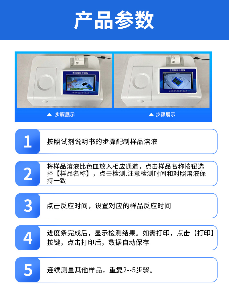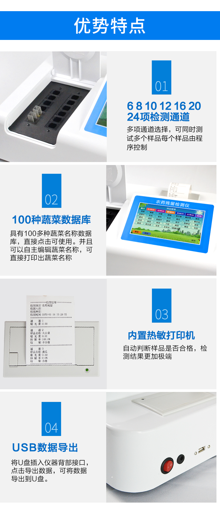 | 乙酰膽堿酯酶和丁酰膽堿酯酶試劑均可以使用,符合國家標準和農(nóng)業(yè)部標準的要求。 | 自動判斷樣品是否合格,檢測結(jié)果更加直觀。 | 儀器具有100多種蔬菜名稱菜單庫,分類管理,并可按需添加或刪除蔬菜名,編輯蔬菜名稱,可直接打印出蔬菜名稱。 | 檢測通道:10個檢測通道,可以同時測試多個樣品,循環(huán)檢測,即放即檢,每個樣品由程序控制分別獨立工作,不會互相干擾。 | 智能操作系統(tǒng),采用更加人性化操作,主控采用多核處理器,主頻1.88Ghz,運轉(zhuǎn)速度更快速,穩(wěn)定性更強。 | 顯示方式:7英寸高靈敏真彩觸摸屏顯示,人性化中文操作界面,讀數(shù)直觀、簡單。 | 打印機采用串口5v打印,可選擇手動打印或者自動打印,三分鐘出打印結(jié)果,打印格式為檢測人姓名、吸光度差值、檢測時間、檢測機構(gòu)、樣品名稱及結(jié)果判定。 | 光源采用進口超高亮發(fā)光二極管,具有低功耗、高精度、穩(wěn)定性強、光源可控可以關掉不使用的光源,響應速度快等優(yōu)點。 | 智能恒流穩(wěn)壓,光強自動校準,長時間連續(xù)工作光源無溫漂現(xiàn)象。 | 儀器具有GPRS遠傳功能,可插手機卡實現(xiàn)數(shù)據(jù)遠傳平臺,wifi聯(lián)網(wǎng)功能,可將數(shù)據(jù)快速上傳電腦,進行數(shù)據(jù)管理與統(tǒng)計。 | 采用USB2.0接口設計,方便數(shù)據(jù)的存貯和移動,并可隨時與計算機直接相連,并且可用計算機控制儀器。實現(xiàn)數(shù)據(jù)查詢、瀏覽、分析、統(tǒng)計、打印等。 | 智能化程度高,儀器具有自檢功能:具有開機自檢和調(diào)零功能,具有自動檢測重復性功能 | 儀器具有自身保護功能,可設置用戶名及密碼,防止非工作人員操作等。 | 采用DC12v直流供電,安全系統(tǒng)更高,并且配備6A鋰電池充電器。 | 儀器具有重新校準、鎖定、恢復出廠設置功能。 |