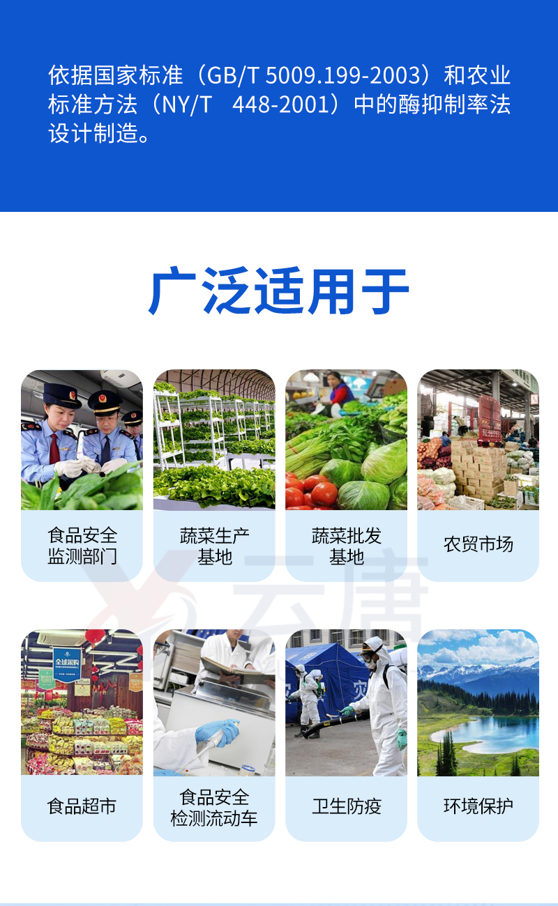 該儀器依據(jù)國家標(biāo)準(zhǔn)(GB/T 5009.199-2003)和農(nóng)業(yè)標(biāo)準(zhǔn)方法(NY/T 448-2001)中的酶抑制率法設(shè)計(jì)制造,能準(zhǔn)確、快速檢測(cè)出蔬菜、水果、農(nóng)產(chǎn)品、茶葉等固體或液體中有機(jī)磷和氨基甲酸酯類農(nóng)藥殘留量。廣泛適用于各級(jí)食品安全監(jiān)測(cè)部門、蔬菜生產(chǎn)基地、蔬菜批發(fā)基地、農(nóng)貿(mào)市場(chǎng)、食品超市、各單位食堂、食品安全檢測(cè)流動(dòng)車、衛(wèi)生防疫、環(huán)境保護(hù)等領(lǐng)域。