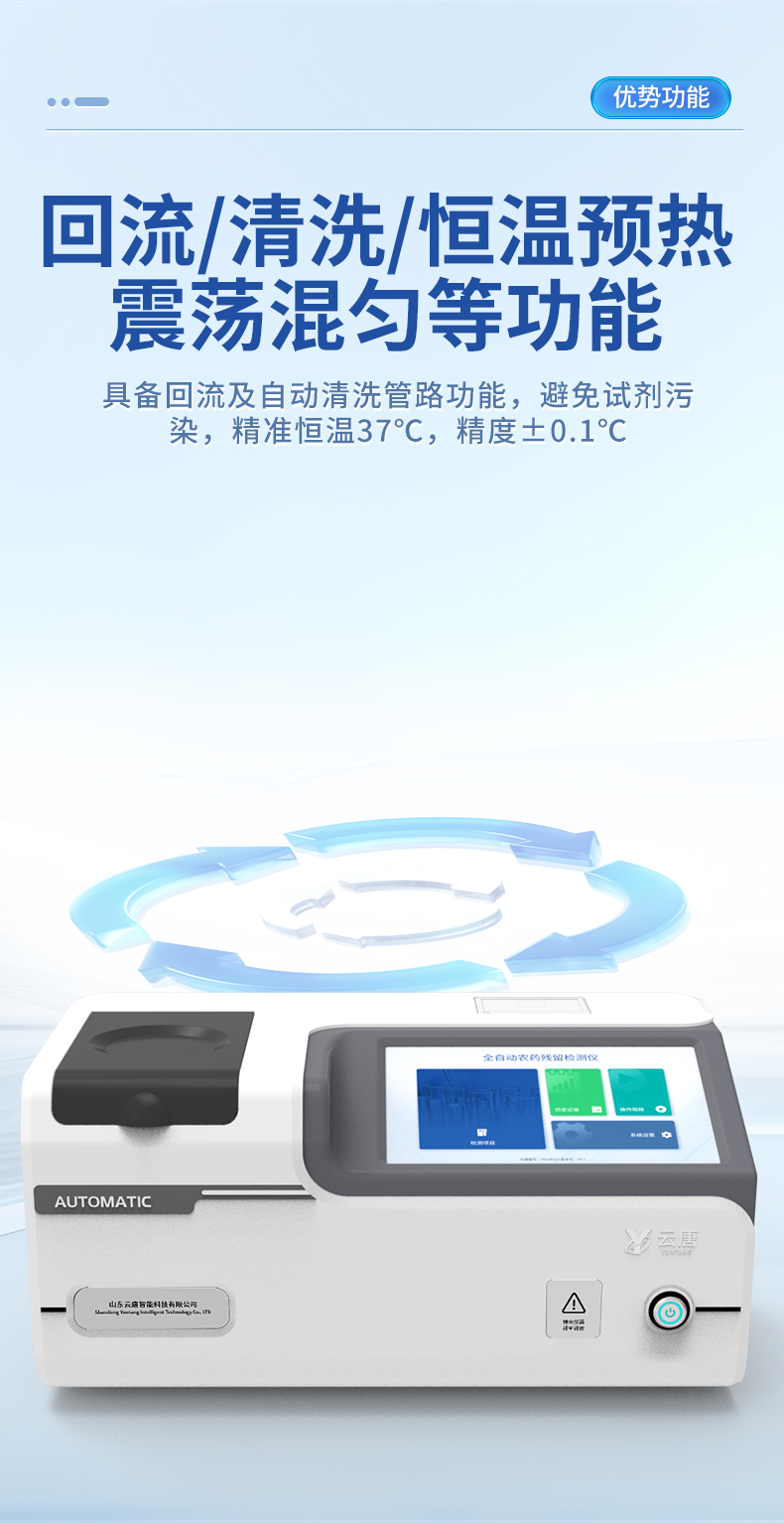 | 1. 試劑位置:3個 | 2. 檢測形式:旋轉24通道比色盤,可任意選擇檢測通道,自動對應選擇通道。 | 3. 系統配置:10.1寸高清液晶觸摸屏,采用ARM Cortex?-A7,RK3288/4核處理器,運行內存1GB。Android7.1.1 系統分辨率1280×800。 | 4.恒溫系統:具有自動加溫溫控系統,精準恒溫37℃,精度±0.1℃。 | 5.添加系統:儀器按照試劑要求自動、按時、按量加入試劑,并且自動對未正常放置的樣本或異常的樣本進行檢查并提示。 | 6.清洗功能:儀器具備回流及自動清洗管路功能,避免試劑污染。 | 7.混勻功能:設備具備自動混勻功能。 | 8.光源校準:設備可自動校準,確保檢測準確度。 | 9.實時監控:儀器測試過程中屏幕顯示運行狀態,可實時查看。 | 10.數據存儲:內部存儲16GB,可存儲500萬條數據。 | 11.樣品多選功能:設備具備樣品一鍵多選功能,選擇樣品自動匹配檢測通道。 | 12.項目預設:可提前設置單個及多個相同或不相同的檢測任務,可單次或者多次調取,減少檢測時間。 | 13.自定義打印系統:內置自定義打印系統,可按需靈活設置開啟或關閉:產品合格證(國家農業部標準),二維碼,抽樣信息、檢測信息,受檢信息等信息的打印。 | 14.A4版本報告打印功能:設備可自動生成A4版報告,A4報告帶二維碼,可掃描二維碼生成電子版,并可識別真偽。 | 15.傳輸方式:儀器配備無線通信模塊: 4G(APN)通訊模塊、Wifi模塊,藍牙傳輸模塊,同時具有USB接口以及RJ45接口能以多種方式實現數據保存和數據傳輸功能,設備數據可以同步上傳至平臺。 | 16.數據監管系統:設備自帶監管平臺,并可同步對接監管平臺,數據可局域網和互聯網數據上傳,檢測結果可直接傳至食品安全監管平臺。達到食品安全問題預估、預警。 | 17.系統遠程更新功能:無需設備返廠,即可遠程實時升級全新系統,節省時間成本及避免運輸造成設備損。 |