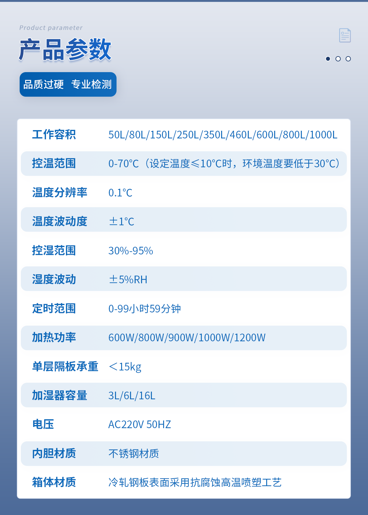 | 工作容積:350L | 箱內照明:日光燈 | 控溫范圍:0-70℃(設定溫度≤10℃時環境溫度要低于30℃) | 程序控制:24段 | 溫度分辨率:0.1℃ | 溫度波動度:±0.5℃ | 控濕范圍:30%-95% | 定時范圍:0-99小時59分鐘 | 加熱功率:900W | 內箱尺寸 寬*深*高(cm):61*51*100 | 外箱尺寸 寬*深*高(cm):74*74*157 | 隔板層數(標配):2層 | 層間隔/mm:38 | 卡槽層數:13 | 加濕器容量(標配):3L | 單層隔板承重:<15kg | 底部總承重:35kg | 電壓:AC220V 50HZ | 整機重量:120kg | 內膽材質:不銹鋼材質 | 箱體材質:冷軋鋼板表面采用抗腐蝕高溫噴塑工藝 |