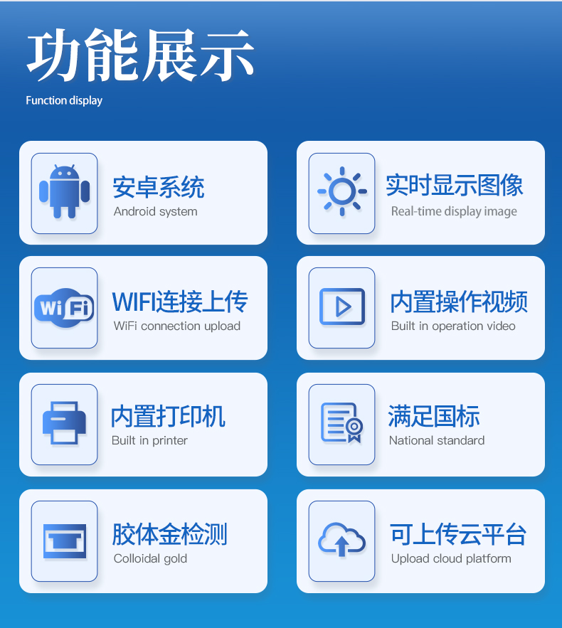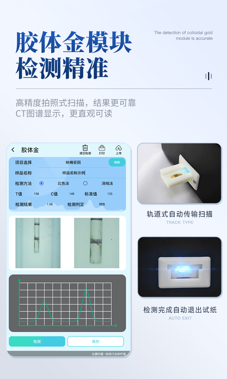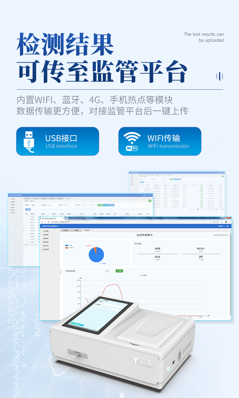 | 儀器采用10.1英寸液晶觸摸屏顯,搭配運行安卓智能操作系統,主控芯片采用ARM Cortex-A7,RK3288/4核處理器,主頻1.88Ghz,運轉速度更快速,性能更強。 | 儀器功能包括:膠體金檢測模塊、數字化管理模塊、無線通訊模塊等,可以滿足同一軟件下實現所有檢測項目的檢測,并在同一窗口展示檢測結果。 | 一體化臺式快檢設備,采用交直流兩用供電方式,可連接車載電源,配備6ah大容量充電鋰電池,可以滿足現場及流動檢測使用的需求。儀器尺寸:43×35×20cm, 主機凈重:5.1kg | 系統自帶數據集成模塊,設備首頁自動統計檢測數據包含:周檢測數據、月檢測數據,全部檢測總數量,均包含檢測總數,合格數,不合格數,以及相關柱形分析圖,對各項檢測數據清晰掌握,無需電腦查詢,更加快捷直觀。 | 儀器具有任務預設模塊,可在樣品送檢前提前預設樣品名稱、檢測指標、送檢單位等信息,樣品送檢時一鍵調取保存信息,檢測更加方便快捷。 | 膠體金檢測模塊: 直插式自動掃描方式,可實時顯示金標卡實時圖像,系統自動分析并呈現出CT曲線圖,CT線自動識別,無需手動調整,完成檢測后自動退出檢測卡。 結果判定線可修改,對照值標定值可保存,斷電不丟失數據。 兼容市場上其他膠體金卡,使用耗材不受限制,極大增強用戶使用體驗。 | 儀器檢測系統擁有龐大數據庫,并且構建了完善的檢索、修訂功能。食品庫涵蓋多種樣品名稱,可按需添加或刪除、編輯樣品名稱;產品數據庫以及歷史檢測記錄支持一鍵檢索功能。 | 系統打印自定義化,打印格式多樣化,產品合格證(國家標準要求),二維碼,抽樣信息、檢測信息,受檢信息、復核信息、抽樣日期、檢測日期等信息結果,可按需求自行設置打印內容。 | A4紙版本報告打印功能(可選配):設備擁有兩種結果展示方式,可以自動生成A4打印模板和小票打印模板兩種樣式,可通過WiFi及網線等方式鏈接外置打印機可進行打印 | 儀器具有 wifi 聯網上傳、RJ45網線連接功能,可以快速上傳數據。同步對接監管平臺,數據可局域網和互聯網數據上傳,檢測結果直接傳至食品安全監管平臺。進行區域食品安全監管及大數據分析處理與數據統計,檢測區域食品安全長短期動態,達到食品安全問題預估、預警。 | 設備支持U盤存儲,標準USB接口,免驅動安裝。檢測結果存儲容量20萬條以上,可生成Excel表格,進行一鍵拷貝,并具有登錄保護功能,可設置用戶名及密碼,規范不同人員操作權限,防止非工作人員操作,并且可以進行重新校準、鎖定、恢復出廠設置功能。儀器固件可升級,后期檢測項目可擴充。 | 儀器具備遠程升級功能,可定向分客戶分儀器更新,開機后自動更新,并可持續性免費更新系統版本,無需像傳統產品返廠更新,節省時間及人力成本并避免了物流運輸返廠升級導致設備損壞的潛在風險。 |