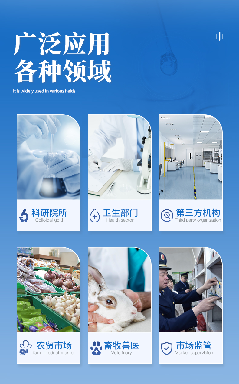 | 瘦肉精激素:鹽酸克倫特羅、沙丁胺醇、萊克多巴胺、己烯雌酚等 | 抗生素殘留:四環素類、硝基呋喃類、磺胺類、β-興奮劑類、沙星類、磺胺類、喹諾酮類,甲砜霉素,氟苯尼考,金剛烷胺、替米考星、慶大霉素、林可霉素、鏈霉素、恩諾沙星、環丙沙星、頭孢啦啶、青霉素、阿莫西林等 | 水產品安全類:孔雀石綠、氯霉素、呋喃妥因、呋喃西林、呋喃它酮、呋喃唑酮等 | 蛋類藥物殘留:氯霉素,四環素,磺胺類,喹諾酮類,呋喃西林,呋喃它酮,呋喃妥因,呋喃唑酮,氟苯尼考,阿莫西林、頭孢氨芐、紅霉素、鏈霉素等 | 動物疫病類:禽流感、新城疫、牛羊口蹄疫、牛羊結核病、牛羊包蟲、牛羊布病、小反芻獸、豬藍耳病毒、豬瘟病毒、豬偽狂犬病毒、豬細小、豬圓環、犬細小病毒、犬瘟熱病毒、犬狂犬病毒等 | 真菌毒素殘留:食用油、糧食及飼料中黃曲霉毒素B1、黃曲霉毒素總量,奶中黃曲霉毒素M1、嘔吐毒素、玉米赤霉烯酮、赭曲霉毒素A、T2毒素、伏馬毒素等 |