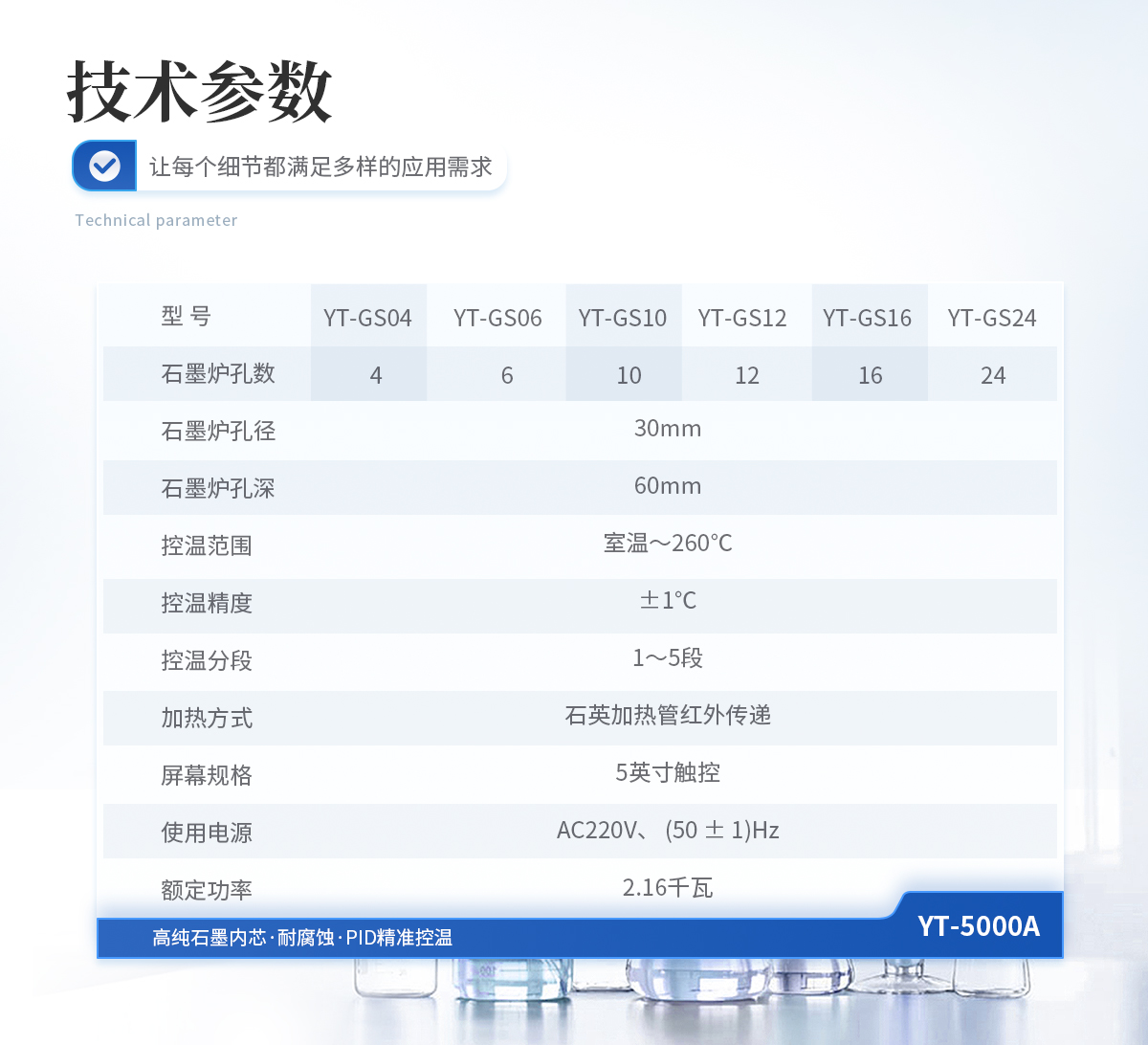 石墨爐孔:孔徑30mm,孔深60mm,孔數5×2 控溫范圍:室溫~260℃ 控溫精度:±1℃ 控溫分段:1~5段 加熱方式:石英加熱管紅外傳遞 屏幕規格:5寸觸控 主機外型尺寸:寬522mm×深371mm×高168mm 使用電源:AC220V、 (50 ± 1)Hz 額定功率:1.6千瓦