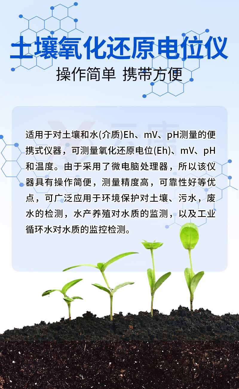 YT-QX6530型智能便攜式氧化還原電位測定儀是一種適用于對土壤和水(介質)Eh、mV、pH測量的便攜式儀器,可測量氧化還原電位(Eh)、mV、pH和溫度。由于采用了微電腦處理器,所以該儀器具有操作簡便,測量精度高,可靠性好等優點,可廣泛應用于環境保護對土壤、污水,廢水的檢測,水產養殖對水質的監測,以及工業循環水對水質的監控檢測。