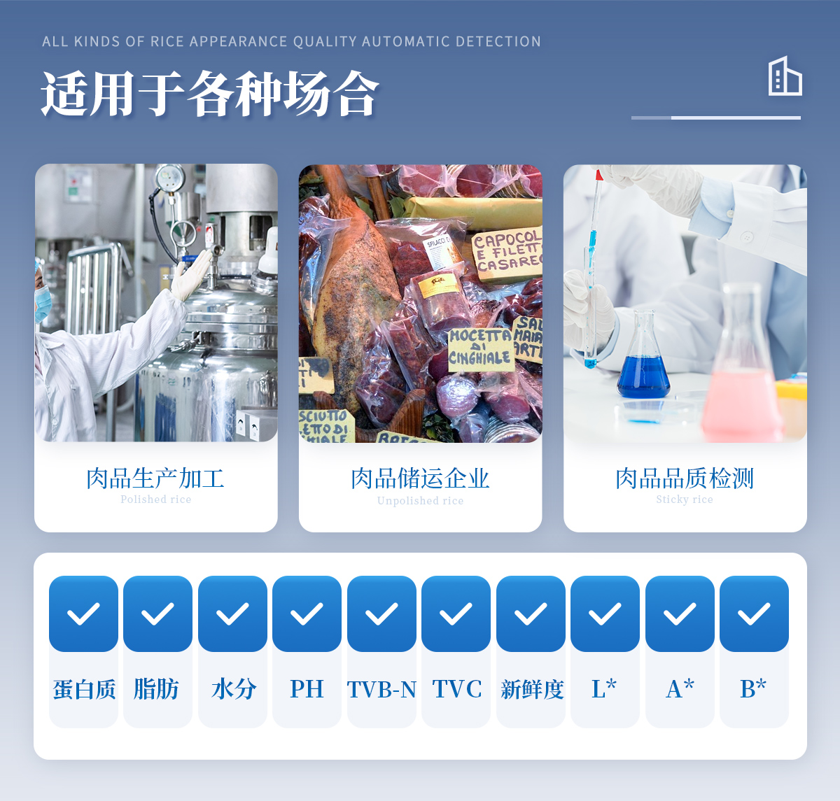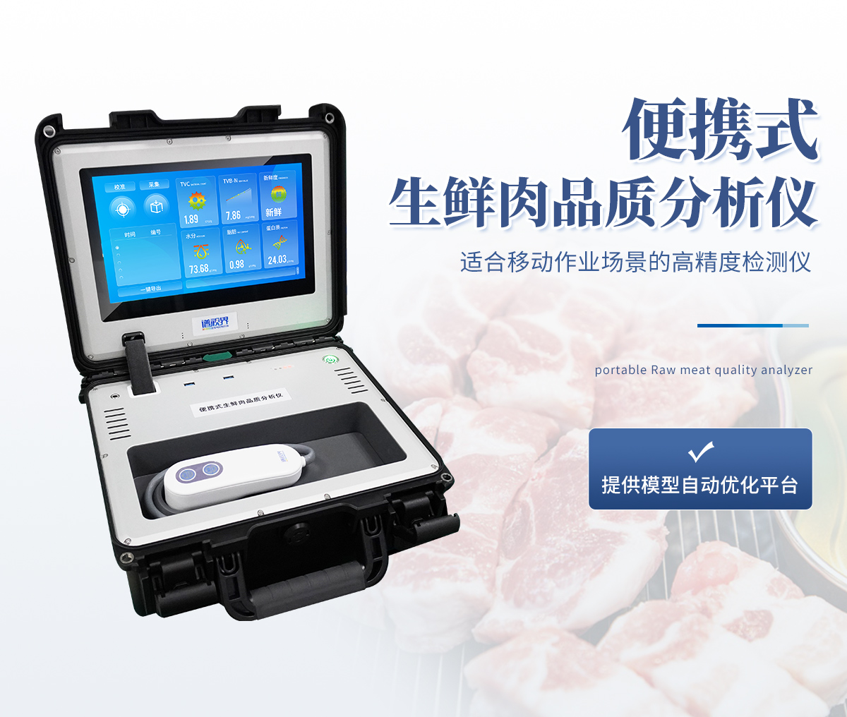可用于檢測生鮮肉的蛋白質、脂肪、水分、pH、TVC、TVB-N、新鮮度、L*、A*、B*等品質參數。配備手提箱式防水減震外殼、大尺寸觸控屏幕并內置大容量電池,可一鍵自動校準,是一款適合移動作業場景的高精度生鮮肉品質檢測儀,其可用于生鮮肉及肉品生產、加工、儲運企業、肉品品質監管部門等。